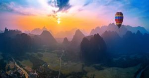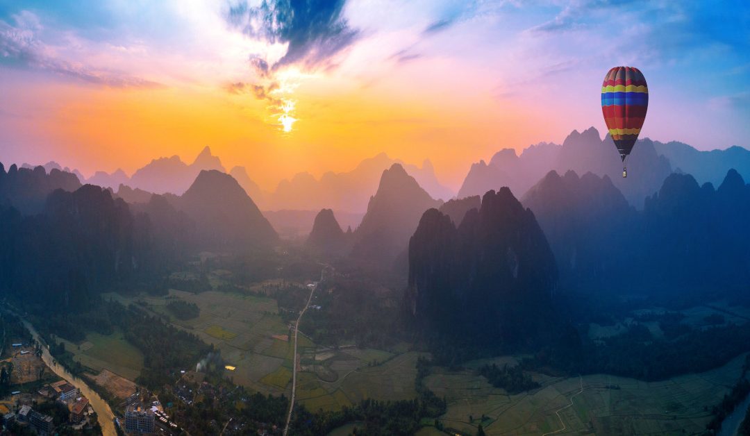 Aerial view of Vang vieng with mountains and balloon at sunset.