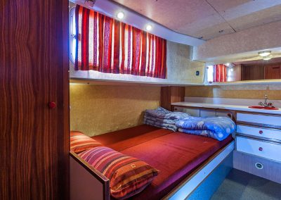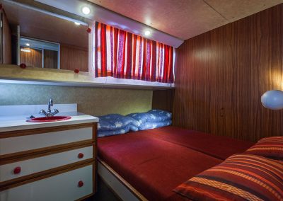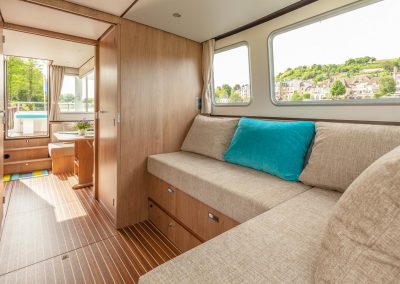 1. P.935 oder P.935W mit einer Kabine und einem Einzelbett. Ideal für ein Paar mit oder ohne Kind. Das Boot besitzt einen Innensteuerstand. Eine Nasszelle, ein Salon/Sitzecke mit Küchenecke sind eingebaut.